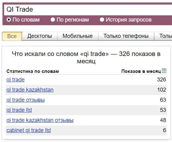 То же название "QI Trade", но написанное с пробелом, пользователи пытались найти в системе Яндекс также не очень часто: всего лишь 326 раз.