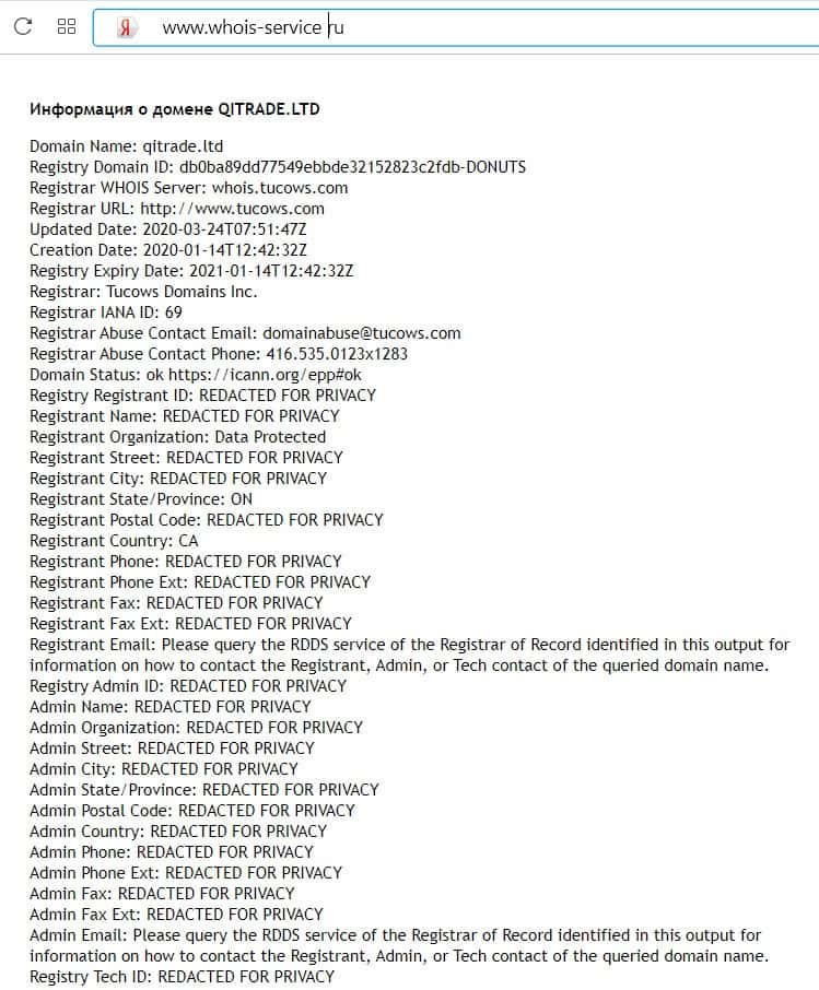 Кому принадлежит доменное имя сайта qitrade ltd, выяснить нельзя, потому что мошенники скрыли информацию о владельце сайта.