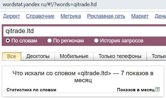 - Количество брендовых запросов в поисковике Яндекс Вордстат по КьюАй Трейд