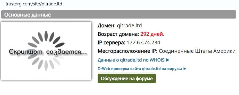 Возраст доменного имени сайта qitrade ltd составляет 292 дня. Контора работает меньше года, если верить информации с сайта Трасторг.
