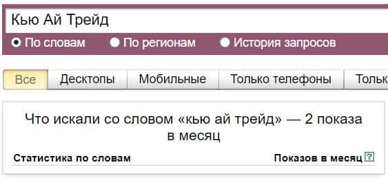 Посмотрим, сколько раз люди искали название бренда "Кью Ай Трейд" на русском языке с пробелами: результат 2 показа.