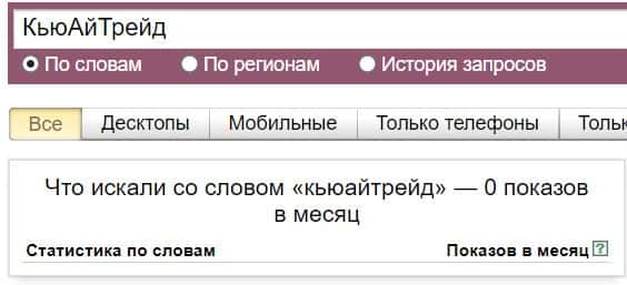 Название бренда на русском языке без пробела "КьюАйТрейд", пользователи не пытались найти в системе Яндекс ни разу.