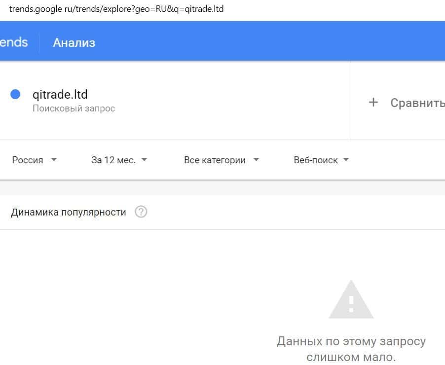 Доменное имя мошеннического сайта "qitrade.ltd" вбивали в поисковую систему Гугл слишком редко, поэтому данных по этому запросу практически нет.