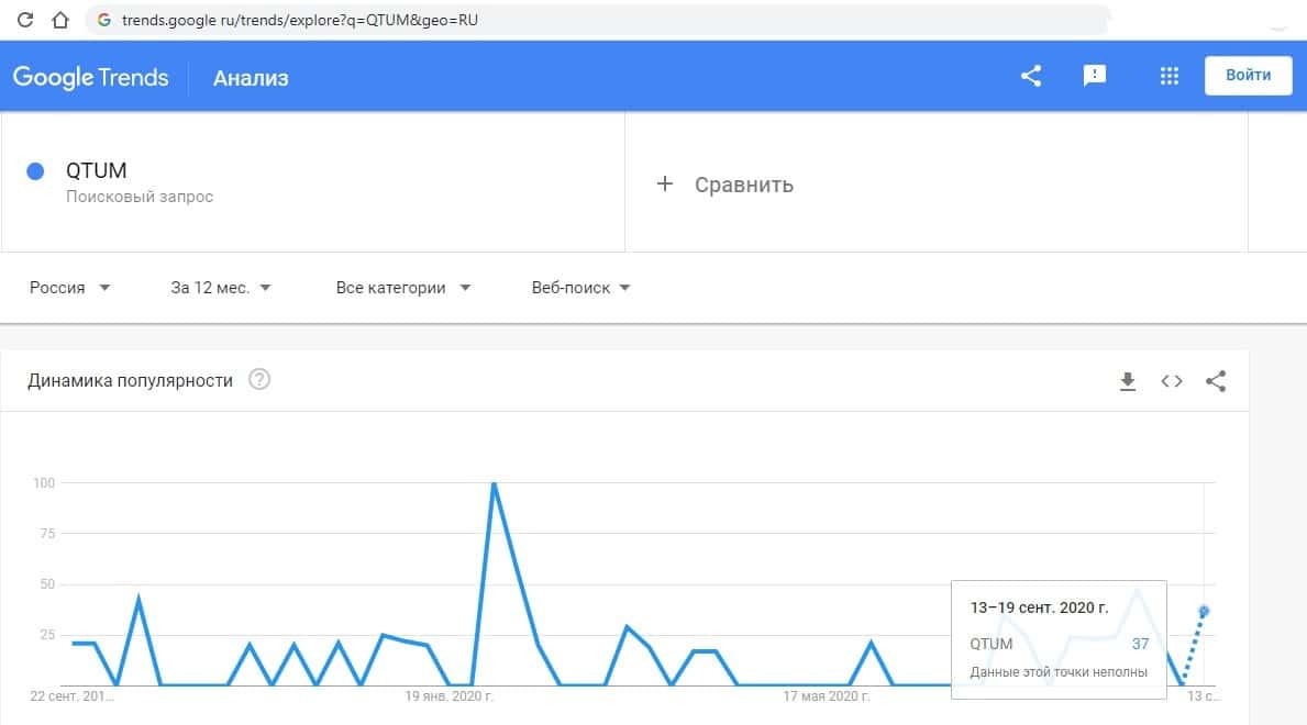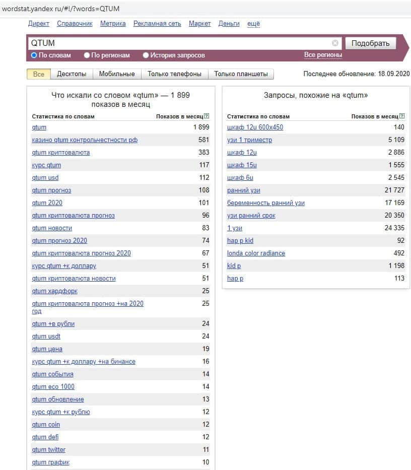 - Какое количество запросов по QTUM показывает Яндекс?
