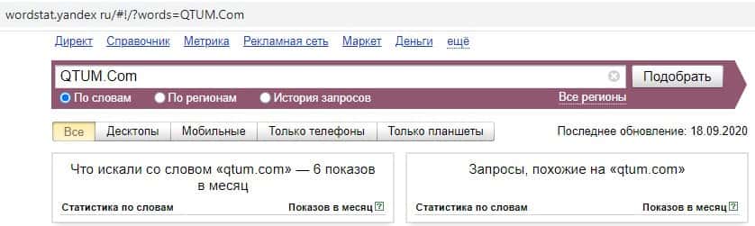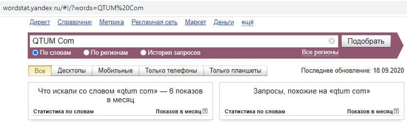 Второй запрос на английском языке в Яндекс с пробелом "QTUM Com" выдает 6 показов в месяц. Это существенно ниже, чем в предыдущем случае.