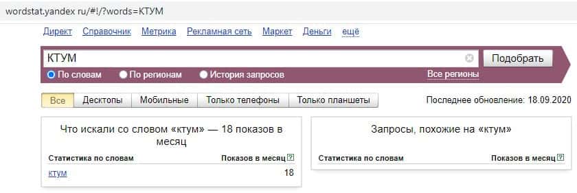 Теперь переходим к запросу на русском языке в яндексе. Единственный запрос на русском языке "КТУМ" выдает 18 показов в месяц.
