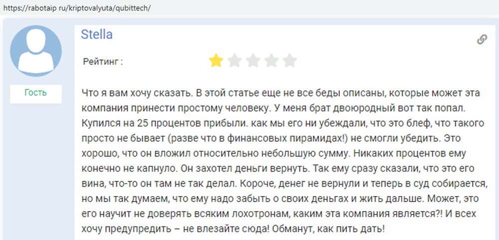 В следующем отзыве человек рассказывает, как его брат попался на уловки кидал вроде шараги КуБит Лайф и потерял деньги. Даже через суд их вернуть не удалось, кидалы скрылись.
