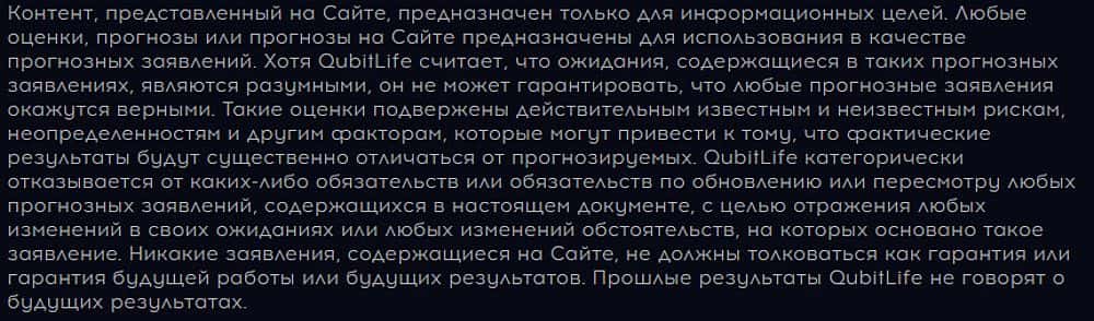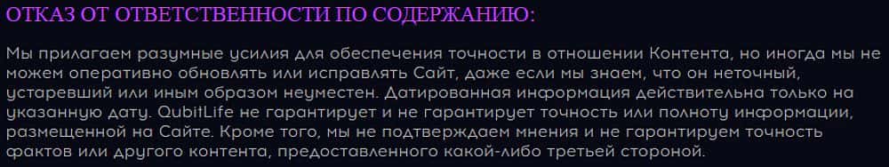 А вот еще одно доказательство, что весь фиктивный проект QuBit Life - это обман. Жулье не отвечает за достоверность той информации, с помощью которой они привлекают на сайт жертв.