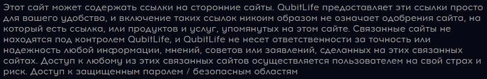 Кидалы QuBit Life снимают с себя всю ответственность за содержимое шарлатанского сайта, который они склепали для развода людей. Контент сайта мошенников - это все обман.