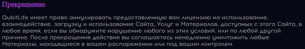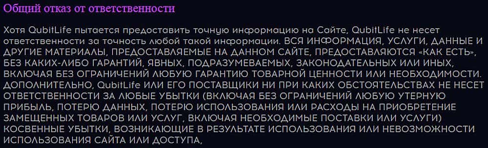 Еще одно доказательство того, что сайт обманщиков QuBit Life несет дезинформацию в интернет-пространство. Посмотрите, аферисты в своем соглашении сами признают все это.