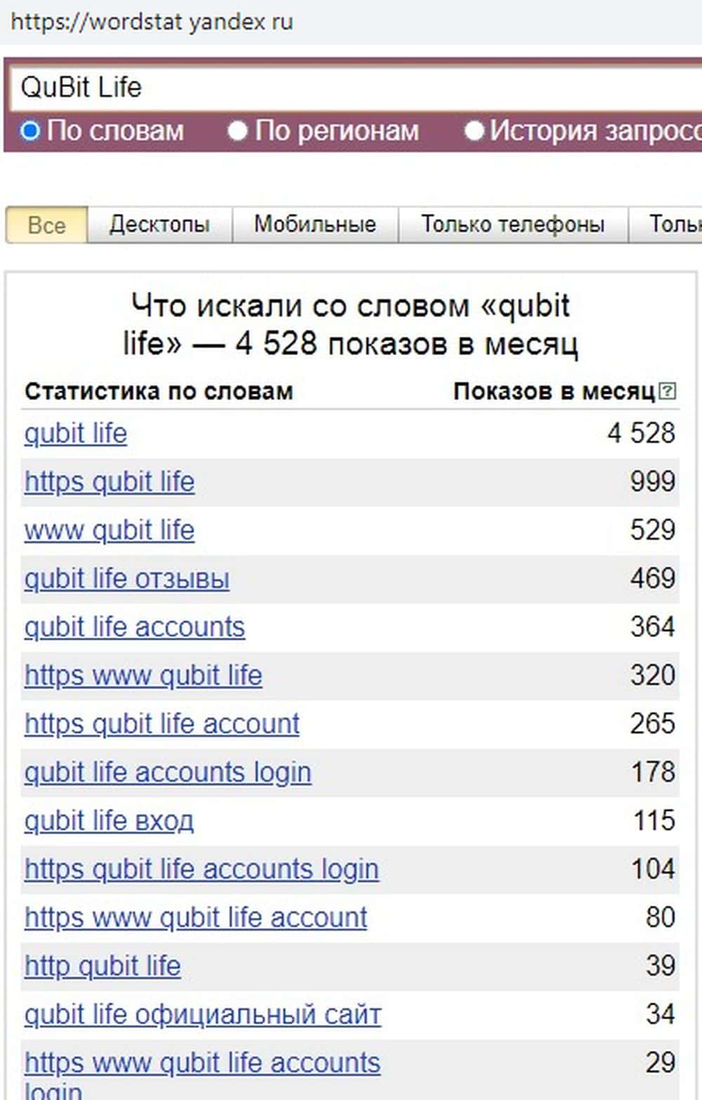 По запросу "КуБит Лайф" показов вообще не было. По многочисленным признаком, этот дешевый хайп скоро свернется, мошенники QuBit Life исчезнут, а люди останутся без вложений.