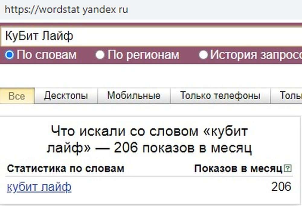 По запросу "КуБит Лайф" было 206 показов. Пользователи поисковика Яндекс в основном искали отзывы о жуликах, которых достаточно, чтобы понять, что их лучше обходить стороной.