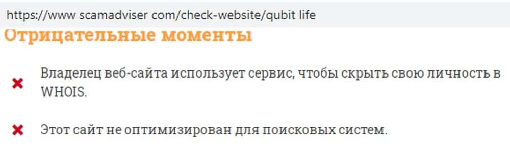 Онлайн-сервис скамэдвайзер ком предупреждает, что с кидалами КуБит Лайф лучше не иметь дел: они прячут данные владельца, сам сайт от поисковых систем - это признаки аферы.