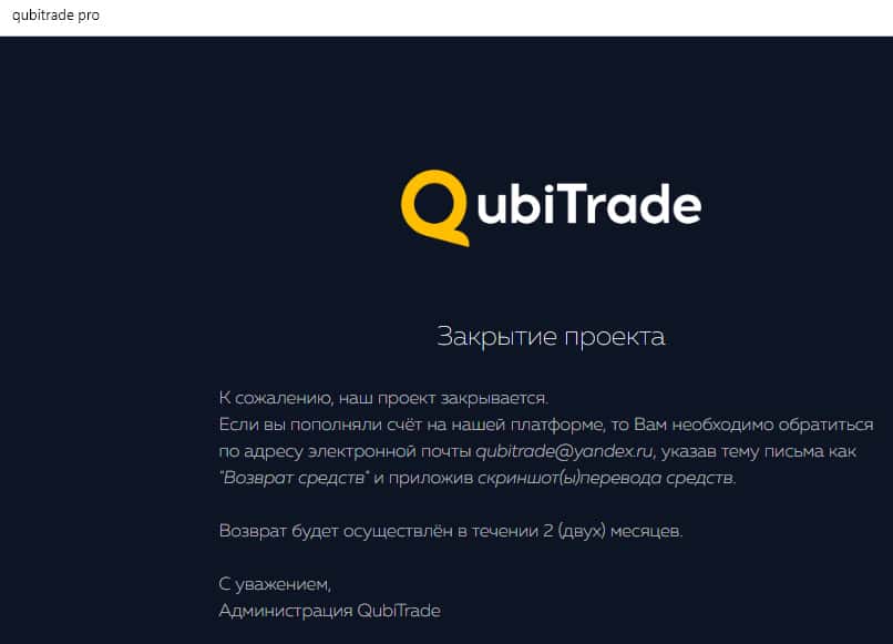 Мошенническая кухня Кьюби Трейд работала не долго и спустя некоторое время соскамилась. Теперь они пишут, что их проект закрывается и нужно обратится по электронному адресу, чтобы получить компенсацию в течении 2-х месяцев. Конечно же это развод и никто жертвам денег не вернет.