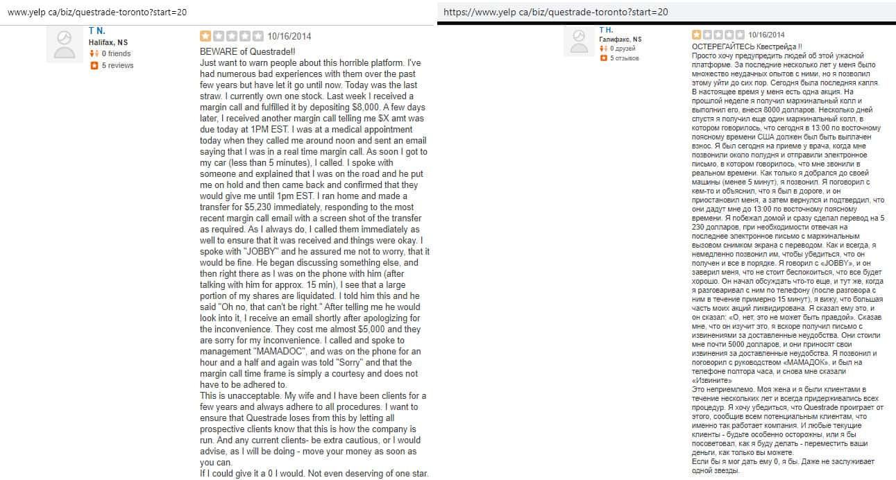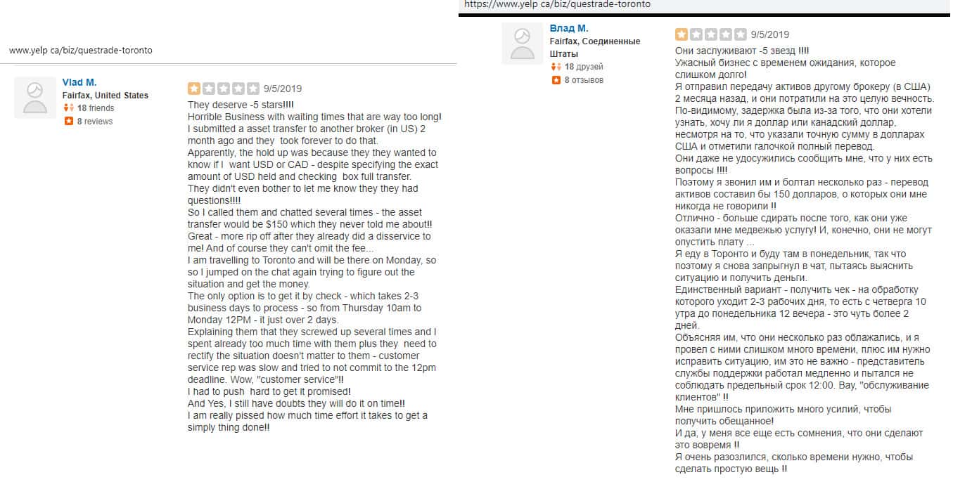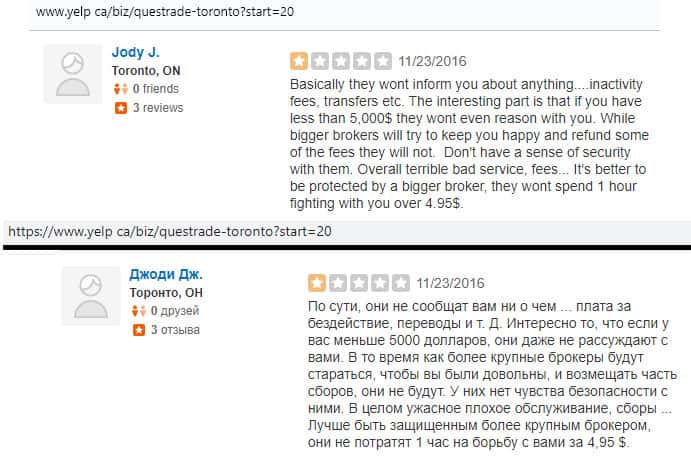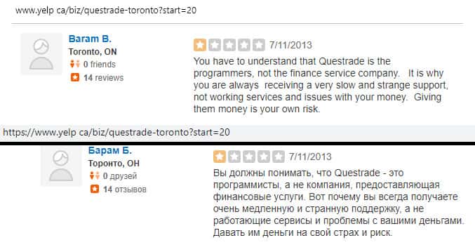 По словам автора отзыва, аферисты Questrade поступили очень нагло, так как за перевод средств из одного брокера на другой, они требовали еще вложить 150 долларов, якобы как компенсационная комиссия. Когда клиент отказался от этого обдиралова, жулье вообще перестало выходить на связь.