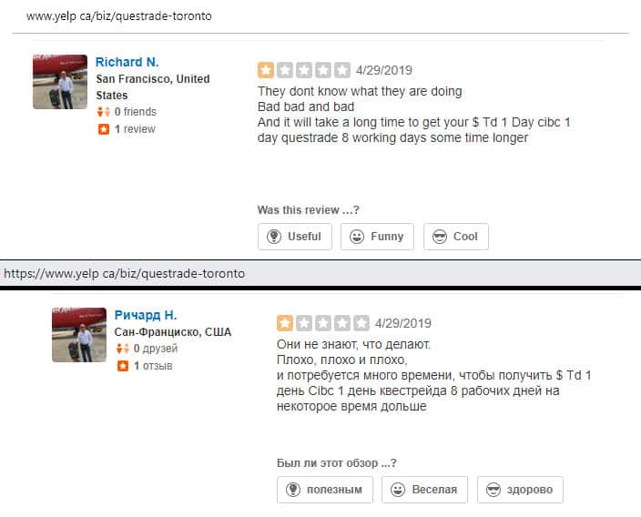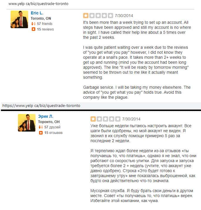 По мнению одного из кинутых клиентов конторой Questrade, там вообще не понимают чем они занимаются, так как он уже не может вывести свои вложенные 1000 долларов уже 8 дней. При чем техническая поддержка продолжает кормить завтраками и не может объяснить нормально причину задержек.