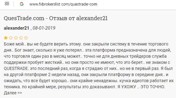 Отзыв о плохом опыте торговли с лохотроном Questrade