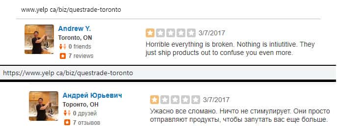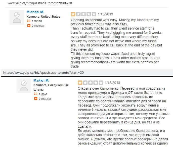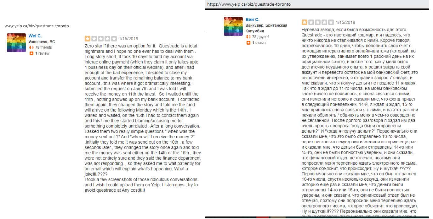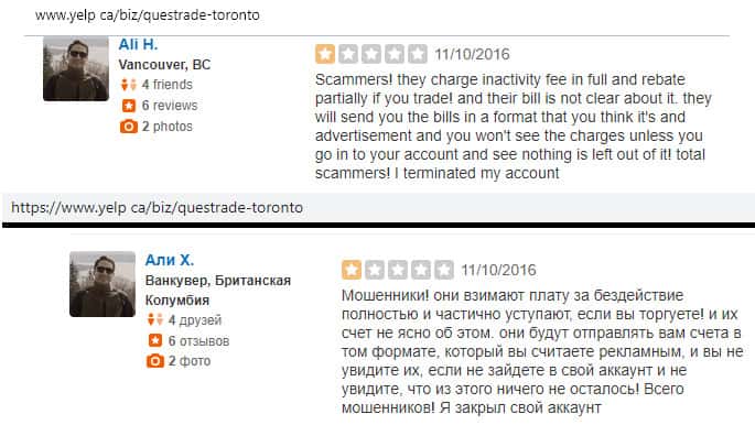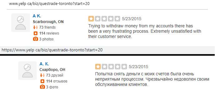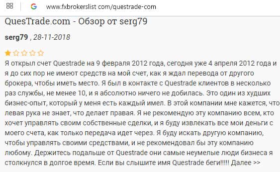 По словам одного трейдера, который решил распрощаться с конторой Questrade, попытка снять средства со своих счетов является очень неприятным процессом. Жулье постоянно выдумывало новые отмазки, чтобы подольше ничего не отдавать. Вот до сих пор ни копейки жертве кидалова не вернули.