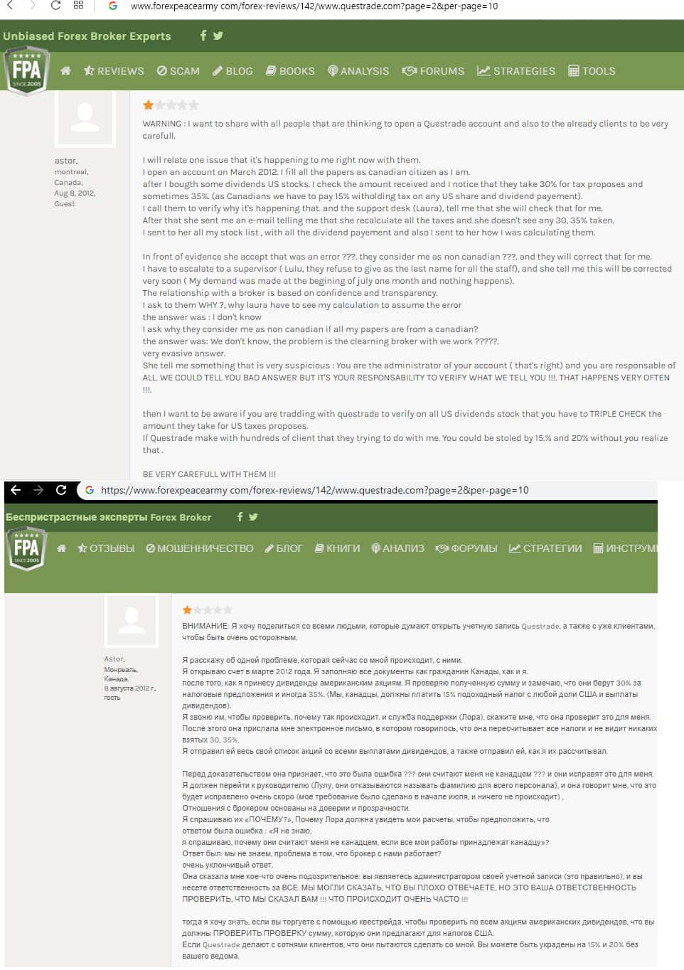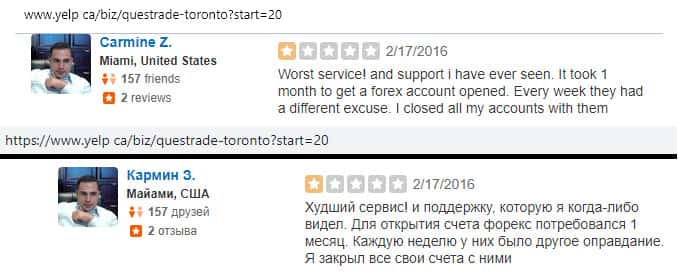 Человек рассказывает, что по своей наивности и глупости, он попался на удочку к аферистам Questrade. Когда он открыл там торговый счет и вложил деньги, то через время его заблокировали, так как стали обвинять, что он имеет несколько торговых счетов, что была полной ложью и клеветой.