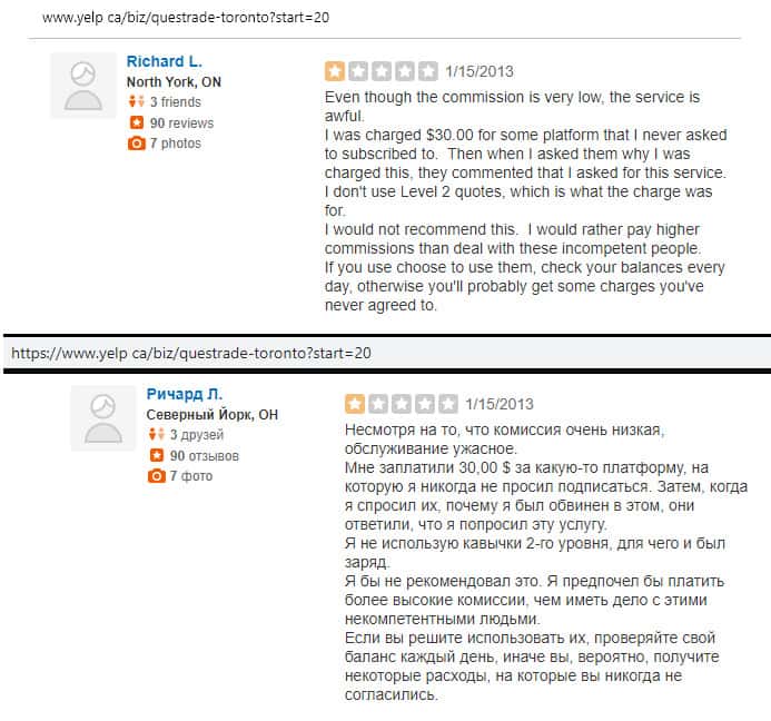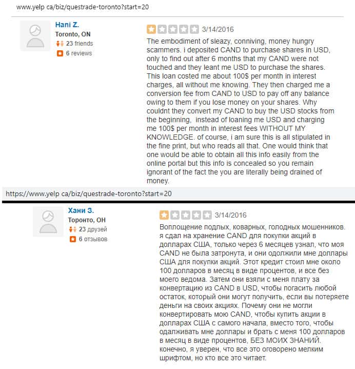 По мнению очередного клиента, который на своей шкуре почувствовал как работает контора Questrade, это ужасная фирма, которая использует свои схемы развода, дабы вытащить как можно больше денег из ваших карманов. Там работают легкомысленные и невежественные сотрудники, которым все равно на вас.