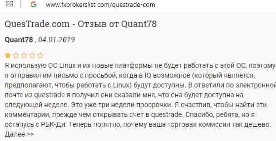 Еще один интернет-пользователь решил попробовать поработать с брокерской конторой Questrade. Он скачал торговую платформу, но когда стал устанавливать ничего не получилось из-за его операционной системы Линукс. В службе поддержки, сказали, что решат вопрос в течении недели, но ответа так и не поступили. Жаль, что деньги он уже перевел.