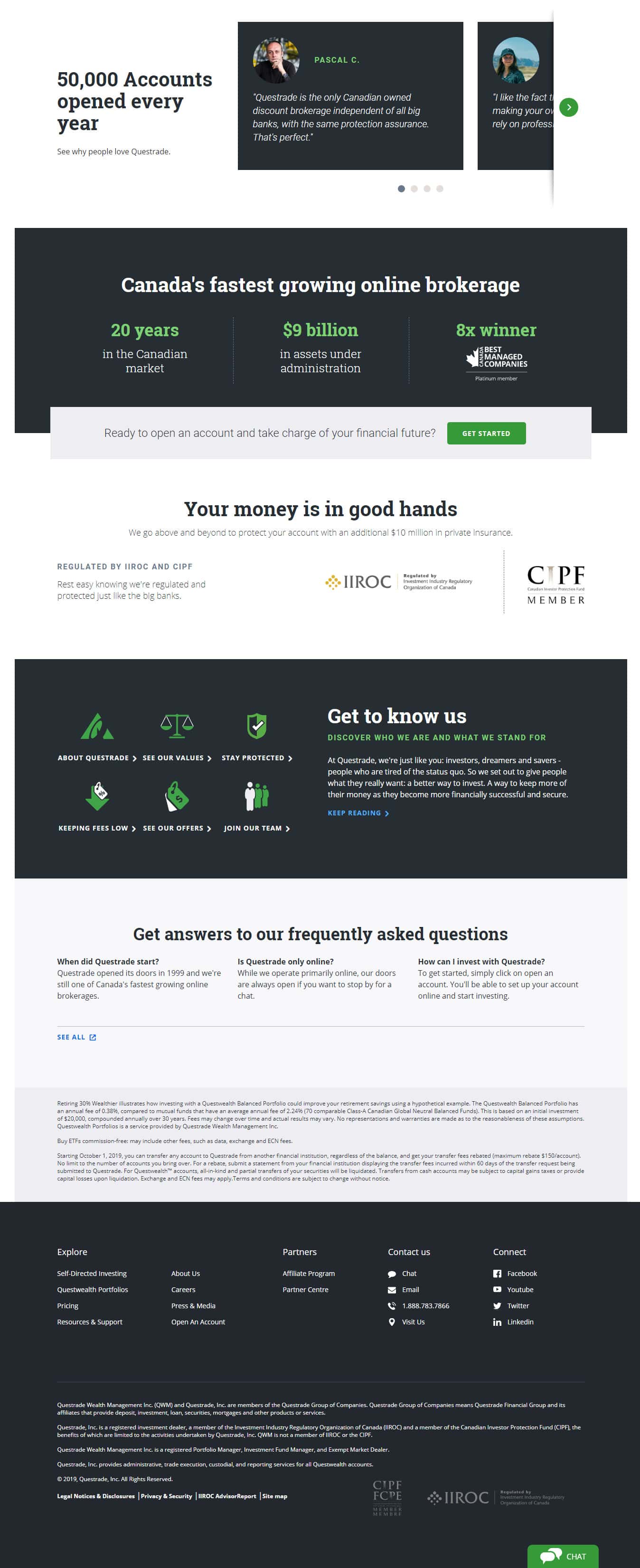 Дилинговая контора Questrade на своем сайте также пытается убедить лохов своими якобы достижениями. Конечно же про количества лет опыта работы, а также 9 миллиардов долларов депозитов клиентов, это конечно довольно перебор. То есть каждый клиент должен поверить на слово без каких-либо доказательств.