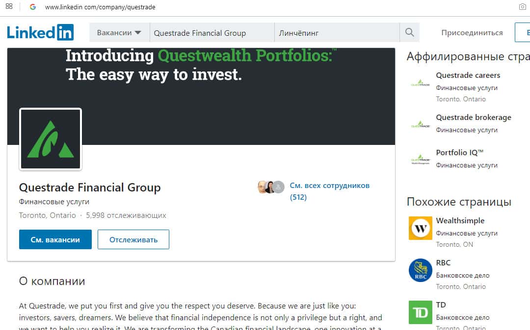 - страничка в ЛинкедИн linkedin com/company/questrade