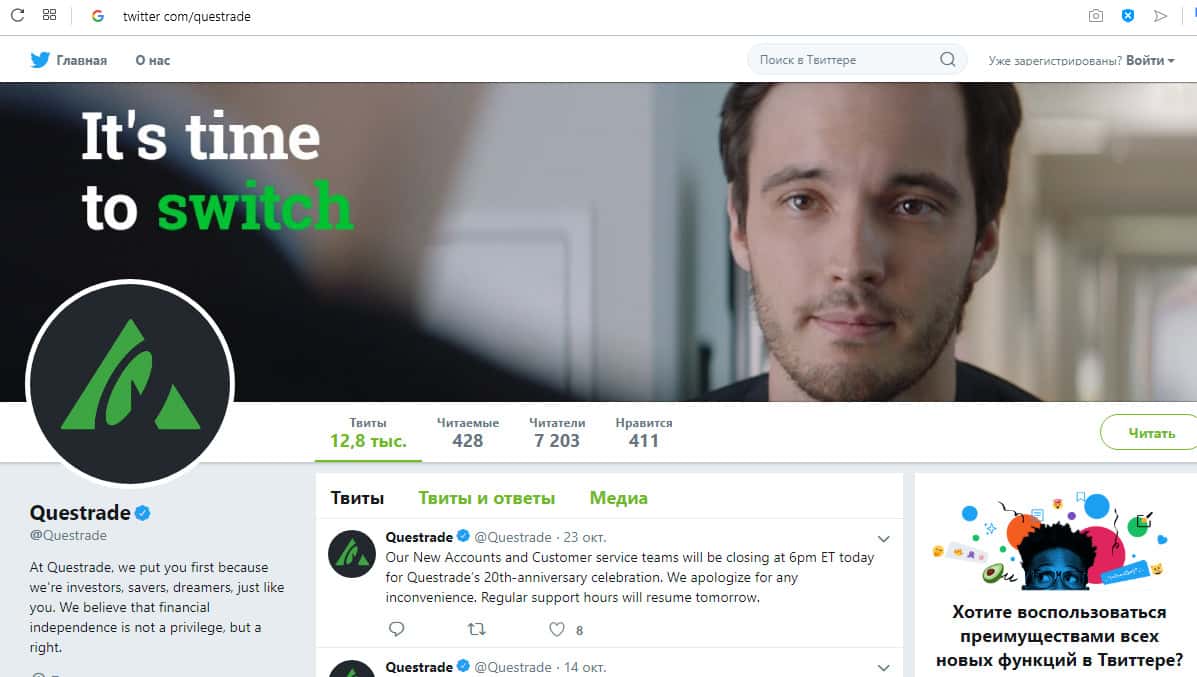 - аккаунт Твиттер twitter com/questrade