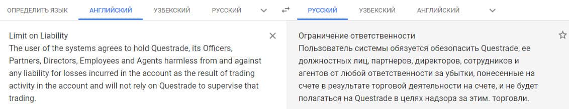 Форекс-контора Questrade предоставила огромное количество различных документов и все же стоит остановить свое внимание именно на Ограничение ответственности. Если вы подписали договор, то вы обязуетесь освободить контору Куес Трейд от ответственности за убытки, которые вы понесете при сотрудничестве с ними.