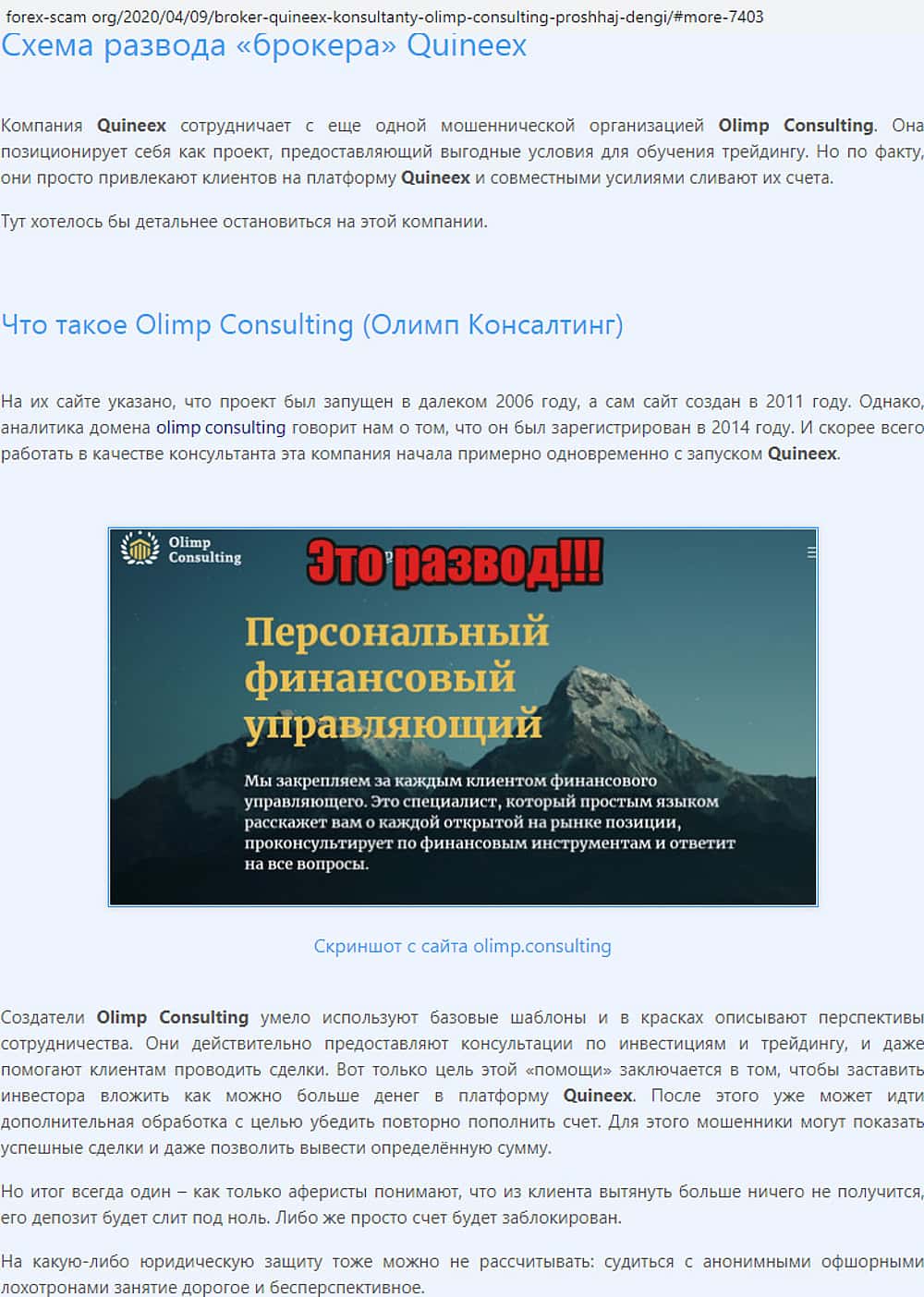 Как уже выяснилось, что кухонные дилеры Куинеекс работают не одни. Потенциальных жертв для этого разводняка поставляет липовый консалтинговый центр Olimp Consulting, который под видом оказания информационной помощи, просто разводит клиентов на депозит у лжеброкера Куинеекс для последующего его слива.