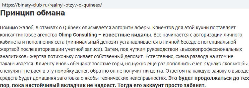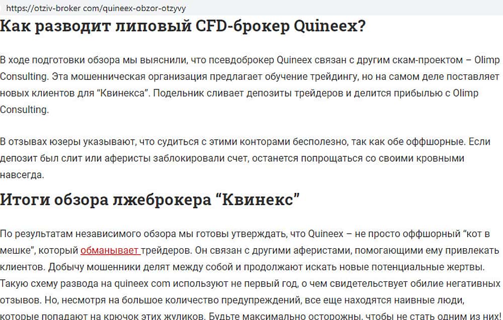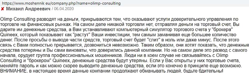 По многочисленным обзорам, можно понять, что работа форекс-разводил Олимп Консалтинг и черного брокера Quineex тесно связана. Первые морочат голову жертве, которая имела неосторожность попасться. Они обещают успех и благополучие, но только если та заведет деньги на счет в фикцию Quineex, а далее сливают их с помощью своих недосоветов.