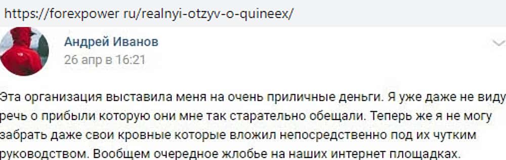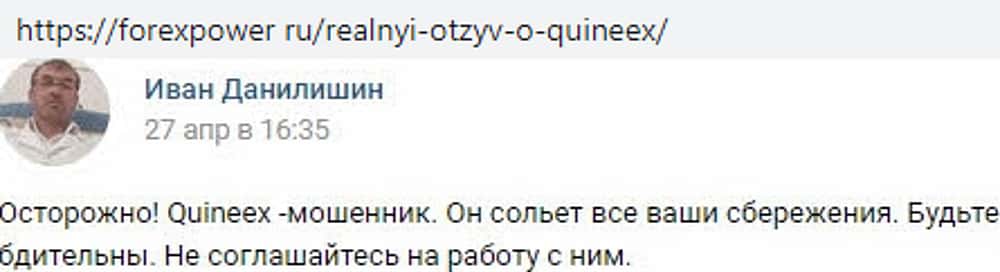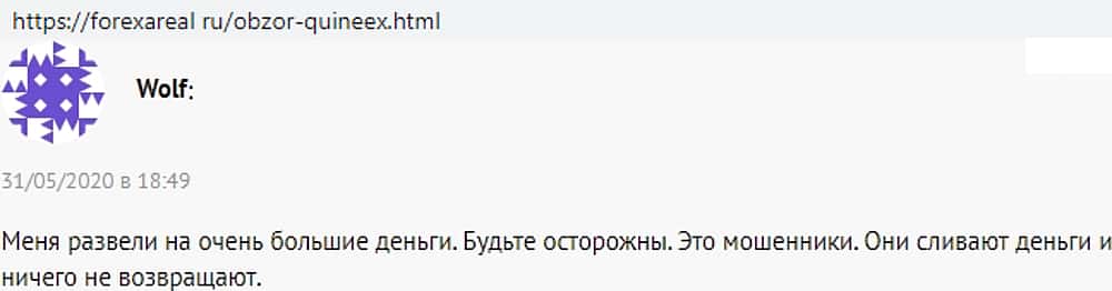 Аферюги Куинеекс ничего не возвращают попавшим в их грязные лапы жертвам. С учетом того, что очень много негативных отзывов в сети Интернет просто подчищаются самими авантюристами Куинеекс, некоторые все же остаются. Один из таких комментариев оставил потерпевший, который потерял большие деньги на лохотроне Куинеекс.