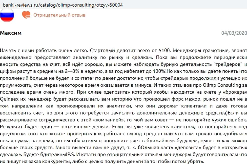 Молодой человек рассказал читателям интернет-дайджеста банки-ревьюс ру, что связка жулья Олимп Консалтинг и Quineex будут имитировать благополучные сделки только до тех пор, пока вы не соберетесь забрать свои средства. Сразу после запроса вывода денег в силу вступает некий форс-мажор, который обнуляет депонированный счет жертвы.