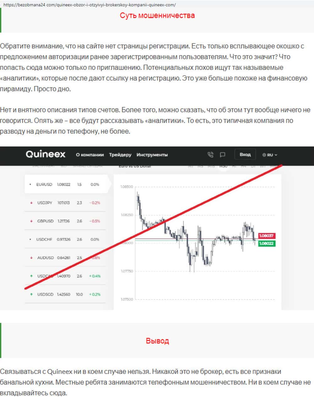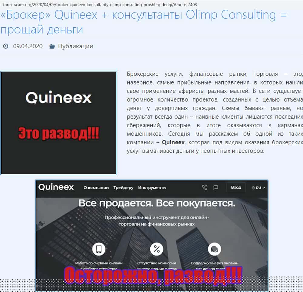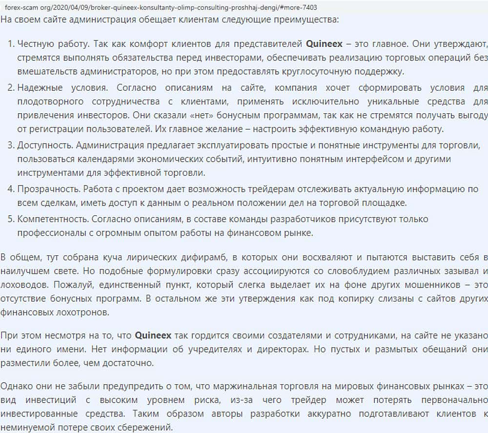 Совместно со своими подельниками Olimp Trade, плутовская шайка Куинеекс заманивает желающих поторговать в свою интернет шарагу. Они обещают давать советы по инвестициям и на своей платформе-имитаторе даже демонстрируют успешность. Но все это для картинки, а на самом деле заведенный депозит уже давно находится в карманах ворюг.
