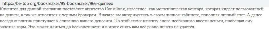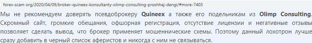 Один из трейдеров, который решил поучаствовать в дискуссии на сайте отзыв ком ру, утверждает, что псевдопроект Куинеекс - это самое обычное шарлатанство. В паре с уже упомянутым Олимп Консалтинг, наперсточники Куинеекс просто занимаются откровенным разводняком, а при попытке вывести деньги, просто блокируют клиентов.