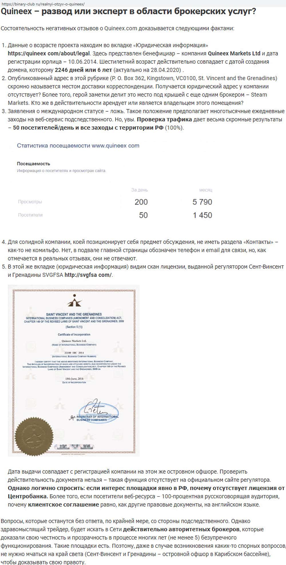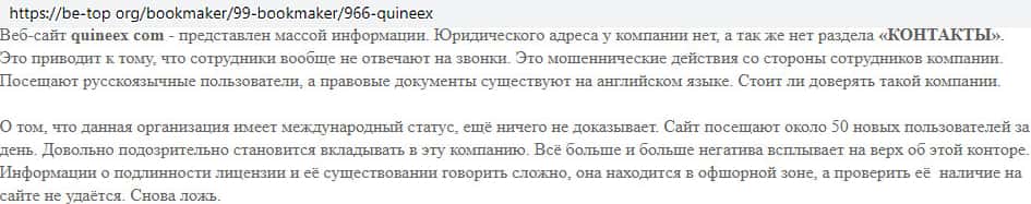 Конторка сомнительного поведения Куинеекс не имеет юридического адреса, а регистрация в оффшорной зоне не позволяет проверить ее лицензию, поскольку такой реестр скрыт. На звонки сотрудники не отвечают. Сайт имея русскоязычную аудиторию, все соглашения содержит только в англоязычном варианте, что еще больше может запутать.