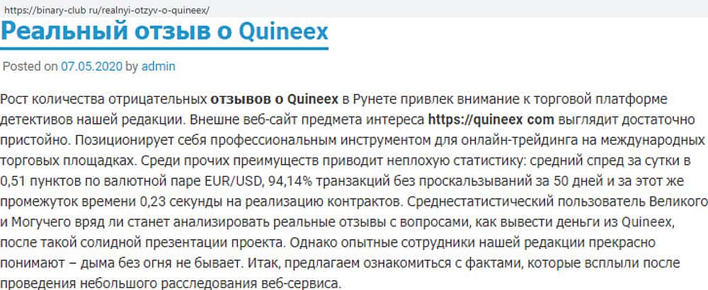 Независимый ресурс бинари-клаб ру, решил провести свое собственное расследование форекс-авантюры Quineex. Аналитиков смутило, что имея хорошие показатели на своем сайте, жулье Quineex получает крайне много негативных отзывов и обзоров в свой адрес. Ведь дыма без огня не бывает и нужно во всем разобраться.
