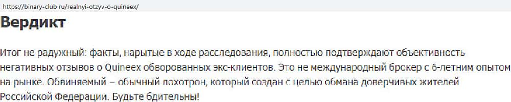По итогам можно смело заявить, что организация, позиционирующая себя как надежный брокер, является просто мыльным пузырем. Ее можно смело ставить в один ряд со всеми известными лохотронами и никогда не связываться с форекс-подвалом Quineex, поскольку это чревато потерей драгоценного времени и денежных средств.