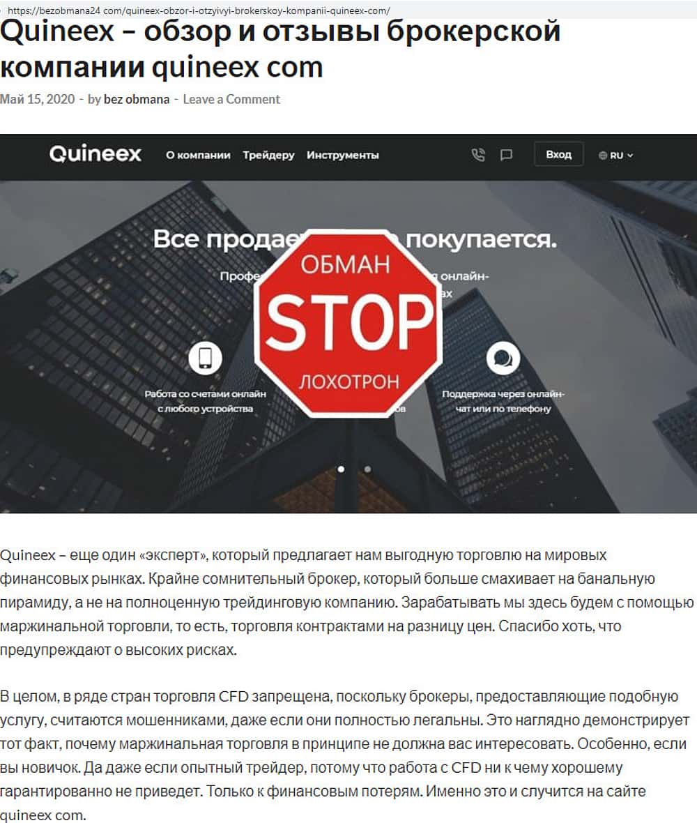 Проходимцы Quineex привлекли внимание авторов сайта bezobmana24 com. Как они отмечают, скам-контора пытается казаться солидным брокером, но получается это из рук вон плохо. Весь проект сидит на шаблонном дешевом сайте и предлагает маржинальную торговлю, которая в принципе опасна даже для опытных трейдеров, не говоря о новичках.
