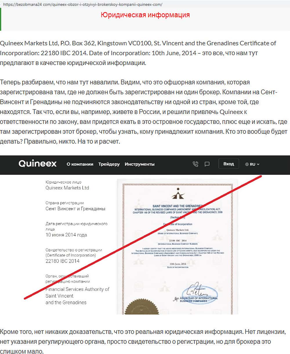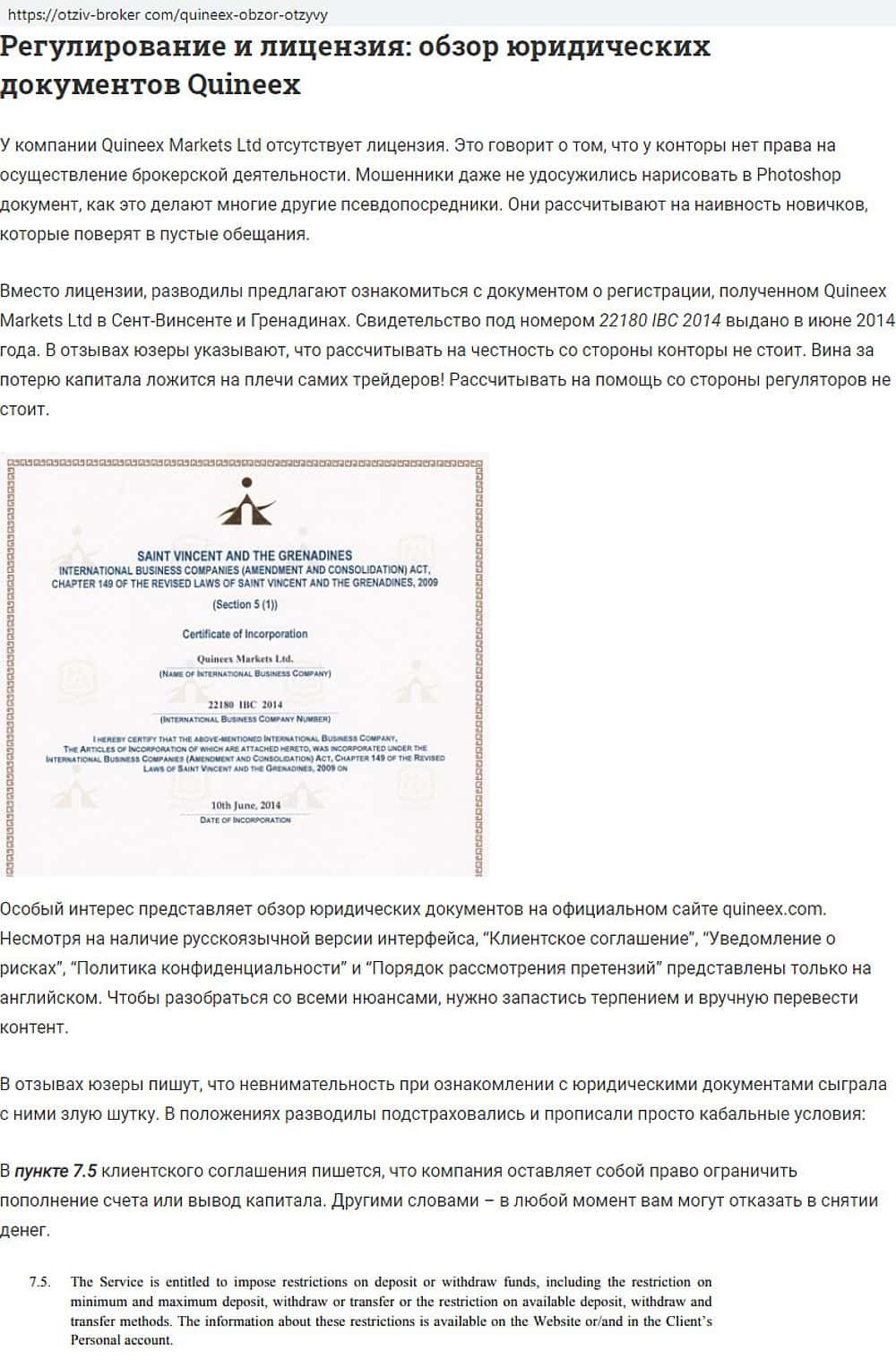 В разделе юридической информации, фиктивный дилер Quineex предоставил скриншот своей якобы лицензии и ее номер. Но вот документ этот всего лишь свидетельство о создании общества с ограниченной ответственностью, а не разрешение на ведение брокерской деятельности, а с учетом отсутствия юридического адреса - это филькина грамота.