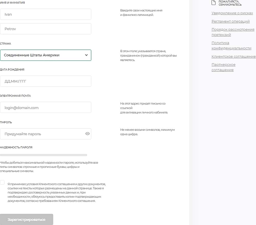 Для регистрации в киберафере Куинеекс, жулье предлагает ввести свою почту, гражданство, дату рождения, ну и конечно имя. Остается только придумать пароль. Также авантюристы предлагают перед этим ознакомится с соглашениями, которые все увы на английском языке и многие по незнанию допускают промахи.