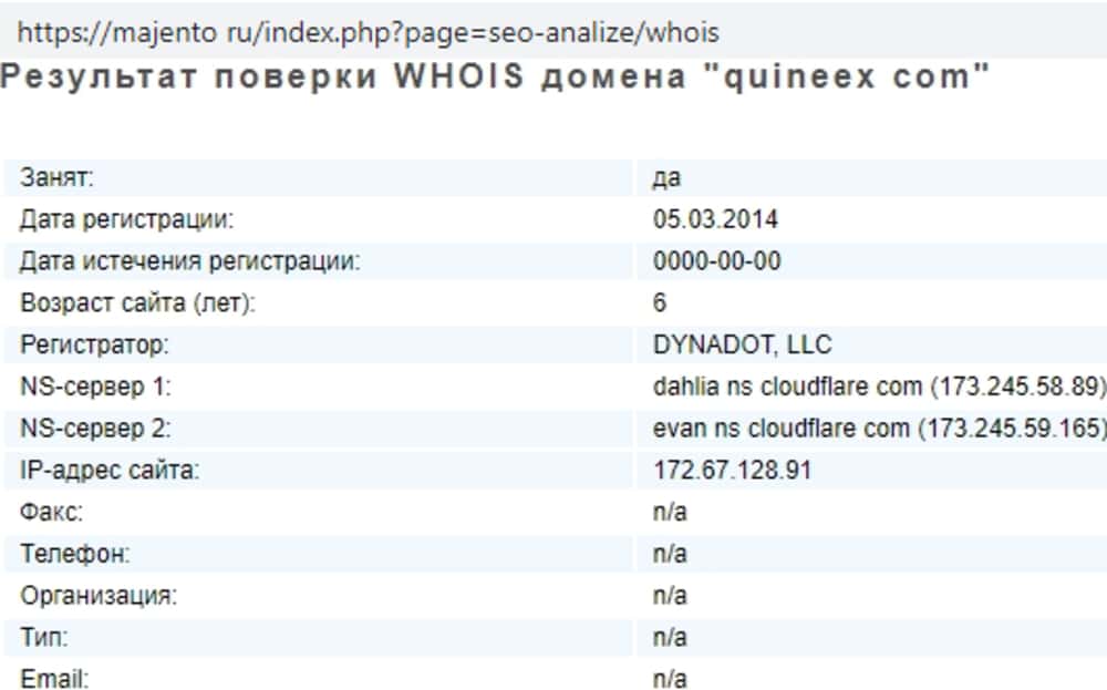 С помощью анализатора мадженто ру и его сервиса whois, удалось выяснить, что настоящие хозяева фиктивного брокера все же предпочитают держать себя в тени. Кроме регистратора, который вручил данный домен конторке Quineex, информации никакой обнаружить не удалось. Это еще раз подчеркивает сомнительность компании Quineex.