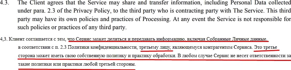 Предыдущий пункт был отмечен в клиентском договоре, но вот у лоховозки Quineex обнаружился и отдельный документ о сохранности конфиденциальной информации. В нем тоже никаких сдвигов и мошенники Quineex снова готовы раздавать ваши личные данные третьим лицам, которые имеют свою неясную политику, поэтому жулье за них не отвечает.