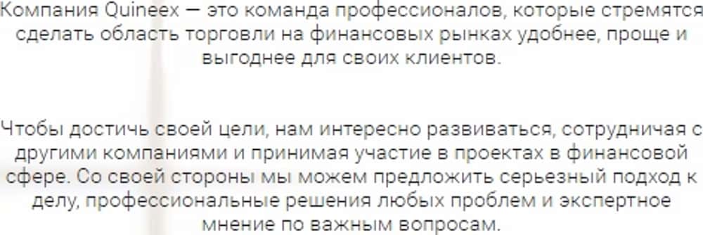 Как и на всех сайтах-мошенниках, которые изображают из себя крутую компанию брокера, когда дело доходит до представления коллектива, то начинается хождение вокруг да около. Мифическая команда профессионалов, аналитики с пятидесятилетним стажем и прочая белиберда. То же самое оказалось и на страницах недоресурса Куинеекс.