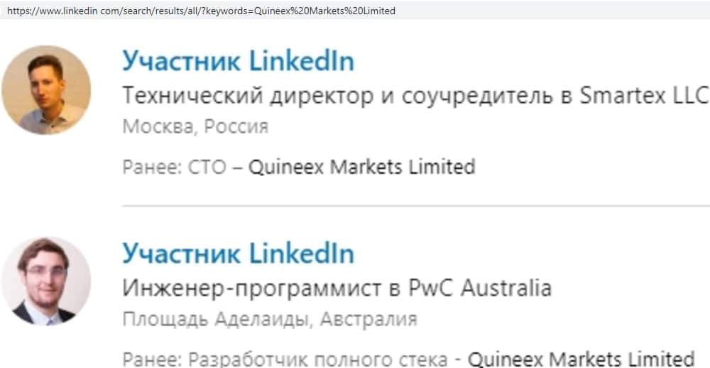 Если оттолкнуться от якобы юридического названия аферистов Куинеекс, а это Quineex Markets Limited, то на страничках сервиса для поиска бизнес-контактов, удастся обнаружить пару человек, которые как оказалось отметили свою работу в данной форекс-богадельне. Предполагаемо сейчас они к ней не имеют отношения, но узнать имена можно: