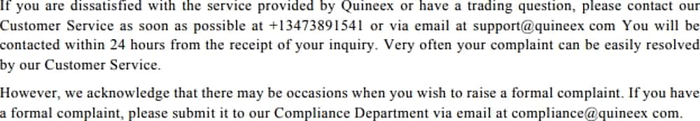 Случайно удалось обнаружить еще немного информации о средствах связи лохотронщиков Quineex. Она оказалась в документах, которые содержали в себе порядок рассмотрения претензий. Номер телефона оказался принадлежащим Соединенным штатам, а почтовые ящики домену шарлатанского проекта Quineex. Еще контакты ворья Quineex: