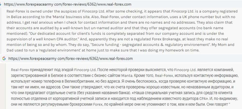 Контора Реал Форекс тратит немало сил на создание положительного имиджа. На разных форумах для этого пишутся заказные положительные отзывы, заказываются фальшивые обзоры. Но не всех удается обмануть - на портале forexpeacearmy com трейдеры говорят, что не доверяют конторе без адреса, лицензии и четко прописанных условий торговли.