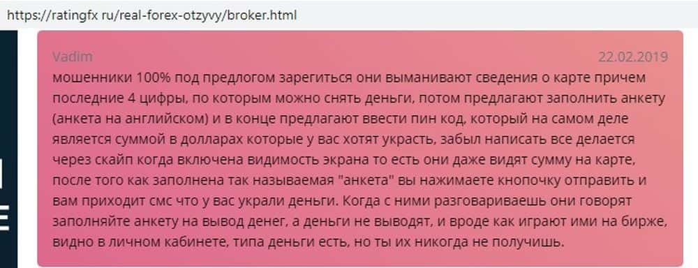 Кидалы Реал Форекс не ограничиваются классическими схемами вроде слива депозита. Если им попадаются наивные новички, они просто воруют деньги. Якобы предлагают помощь с переводом по скайпу в режиме демонстрации экрана, а когда узнают данные карты, скидывают деньги себе на счет - об этом рассказывается на портале ratingfx ru.