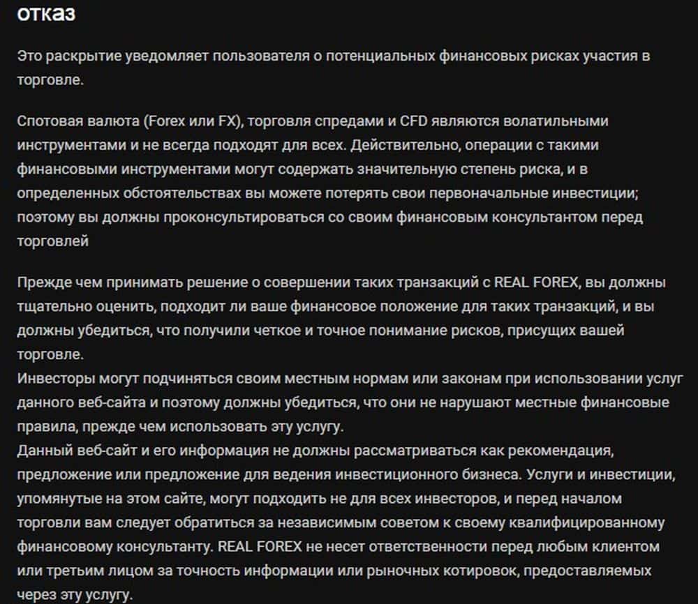Ожидаемо, что никакого клиентского соглашения на странице жуликов Real Forex нет. Они утверждают, что их офисы находятся в Белизе, Великобритании и Франции и нацелены на предоставление своим клиентам качественных услуг. Но на основном ресурсе вместо клиентского соглашения - отказ от любой ответственности.