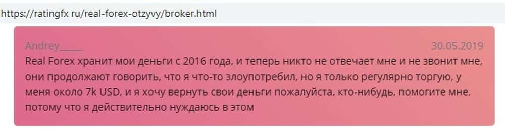 На том же веб-ресурсе рейтингэфикс ру трейдер делится своей историей. Он попытался работать с жуликами Реал Форекс еще в 2016 году, они развели его внести последние деньги на счет. Как только он попытался их вывести, менеджеры начали лепить нелепые отмазки, а потом и вовсе пропали. Уже 5 лет он не может забрать у мошенников 7000 долларов.